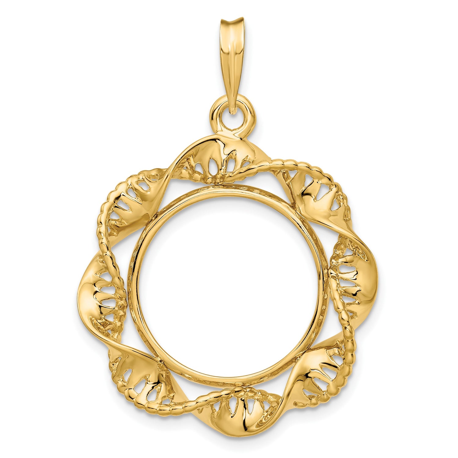 17.8 mm Coin Bezel Pendant Prong Set Fancy Twisted Ribbon in 14k Yellow Gold