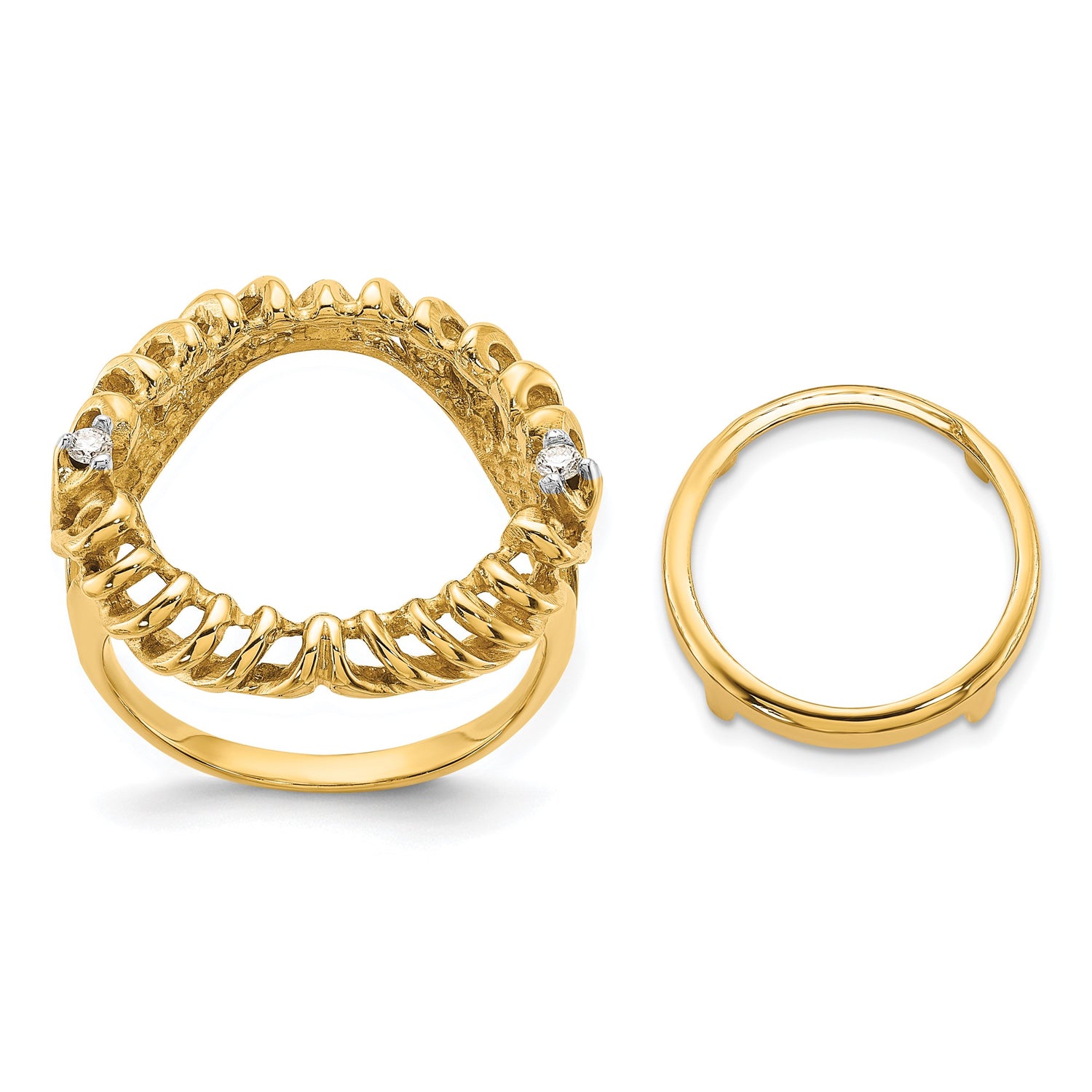 Australian 1/20 oz Gold Kangaroo $5 Coin Bezel Ring Prong Set Fluted Wire Two Diamond in 14k Yellow Gold