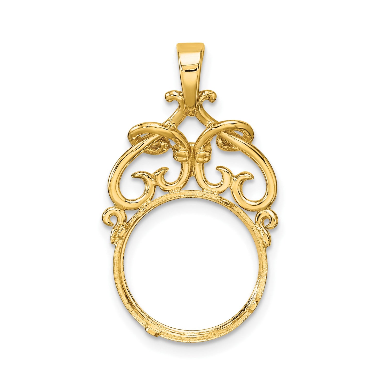 Mexican 2 Pesos Gold Coin Bezel Pendant Prong Set Baroque Diaomond-Cut Scrollwork Design in 14k Yellow Gold