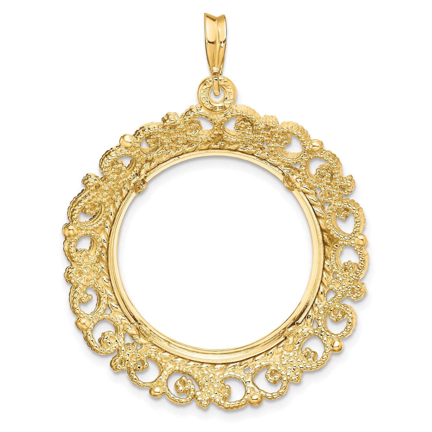 US Gold Indian Head Half Eagle $5 Coin Bezel Pendant Prong Set Fancy Filigree Victorian (22 mm) in 14k Yellow Gold