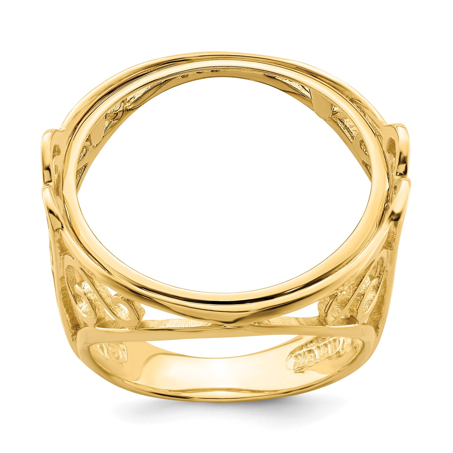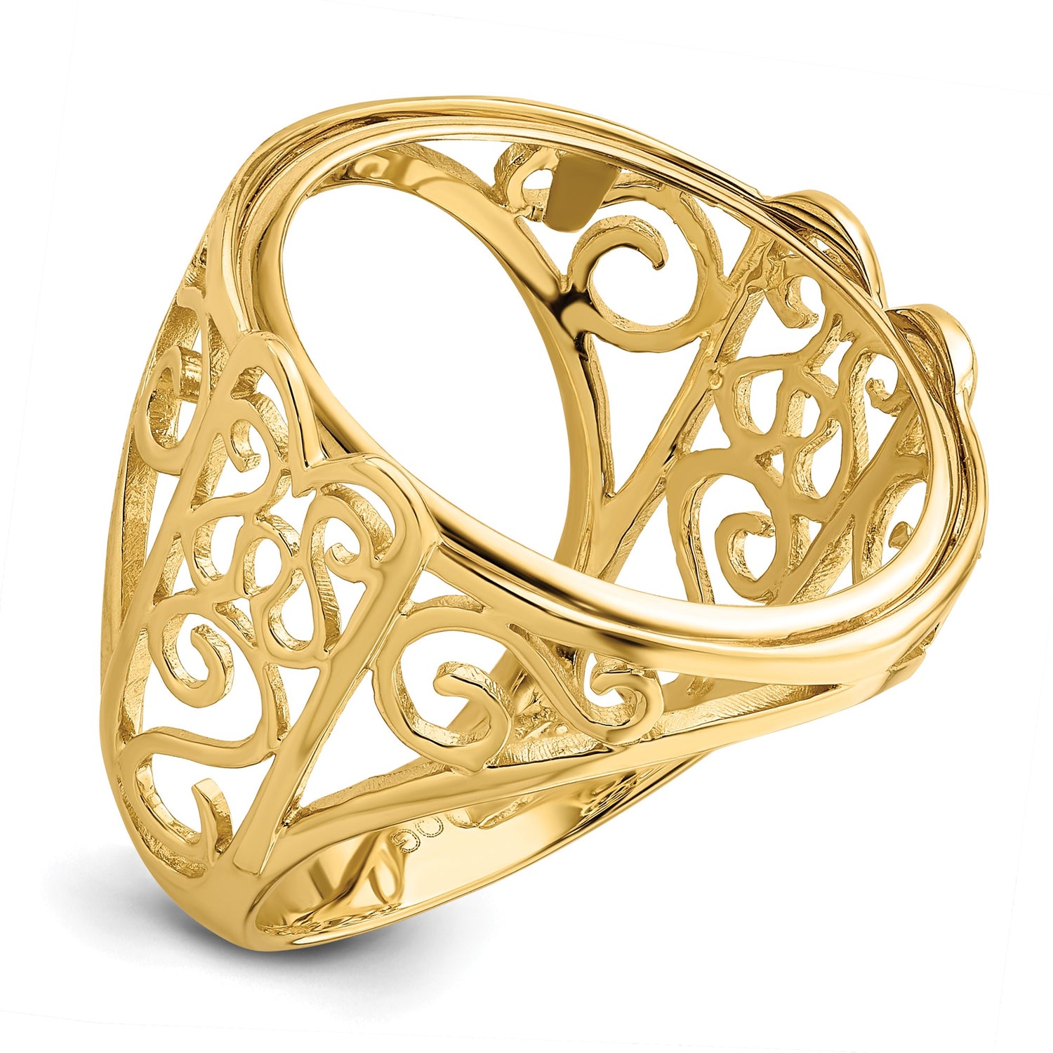 US Gold Liberty Head Half Eagle $5 Coin Bezel Ring Prong Set Polished Curled Filigree in 14k Yellow Gold