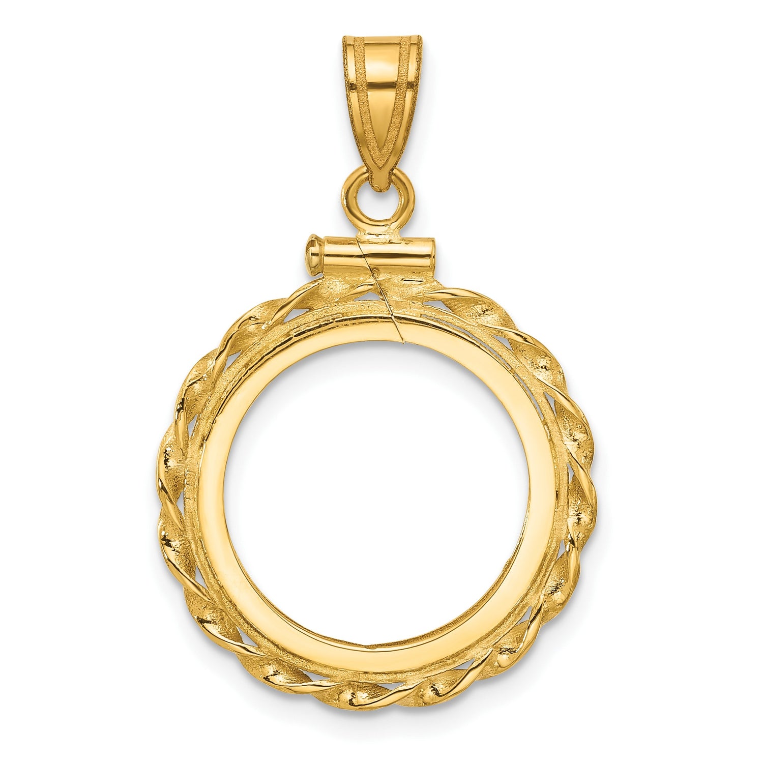 South African 1/10 oz Gold Krugerrand Coin Bezel Pendant Screw Top Wide Twisted Wire in 14k Yellow Gold