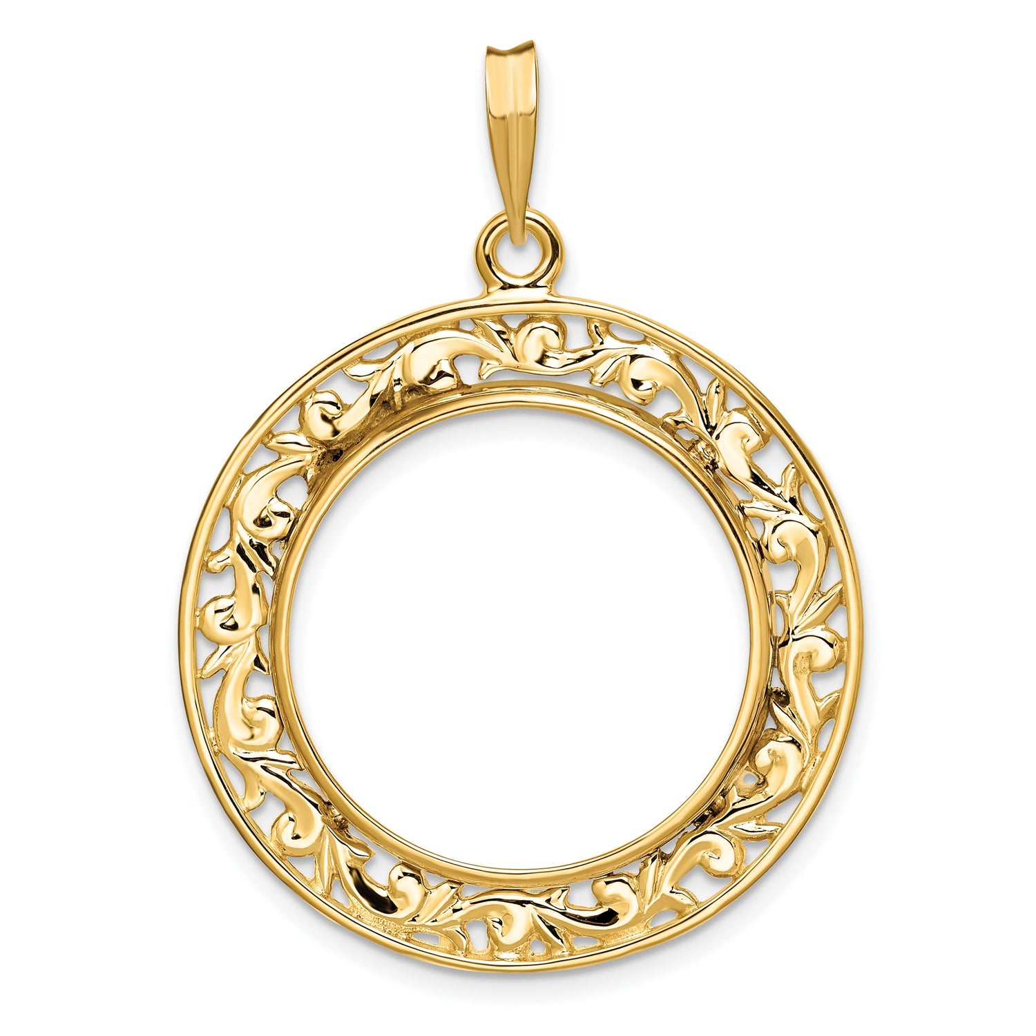 South African 1/4 oz Gold Krugerrand Coin Bezel Pendant Prong Set Open Filigree Border in 14k Yellow Gold